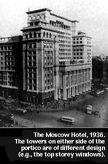 "The Moscow Hotel is of particular interest because its facade, for no clear aesthetic reason, is asymmetrical. Legend has it that Stalin himself, when presented with a drawing that incorporated, on either side of a vertical axis, two alternative designs for the facade, placed his signature in the centre of the sheet, apparently approving both variants. No one dared tell him - whom the Union of Soviet Architects addressed as 'Chief Architect and Builder of our Socialist Motherland' - of his oversight, if oversight it was."