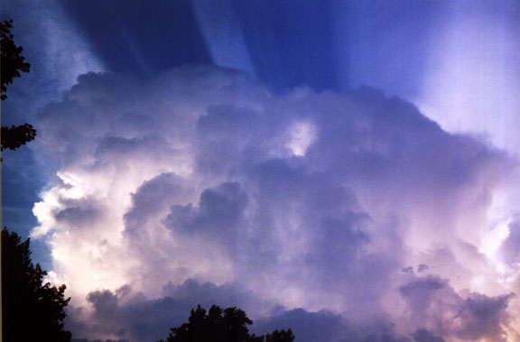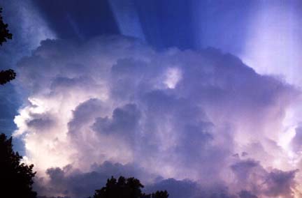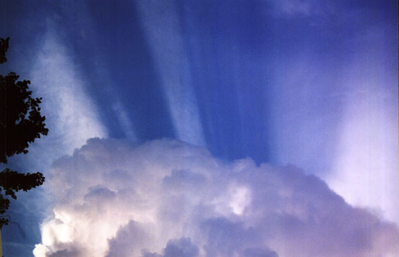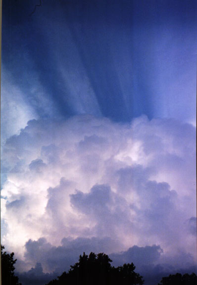 Finally, these storms were exceptionally photogenic from my home in Edwardsville, because they were directly between my location and the sun. They cast shadows over some cirrus debris from earlier convection, and the adjacent shadows and crespicular rays created spectacular arcs of light and shadow above the storms.
