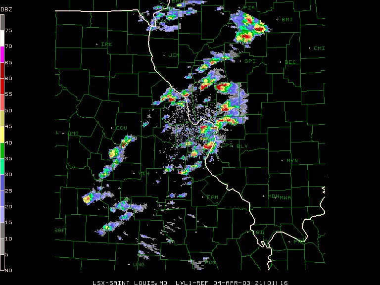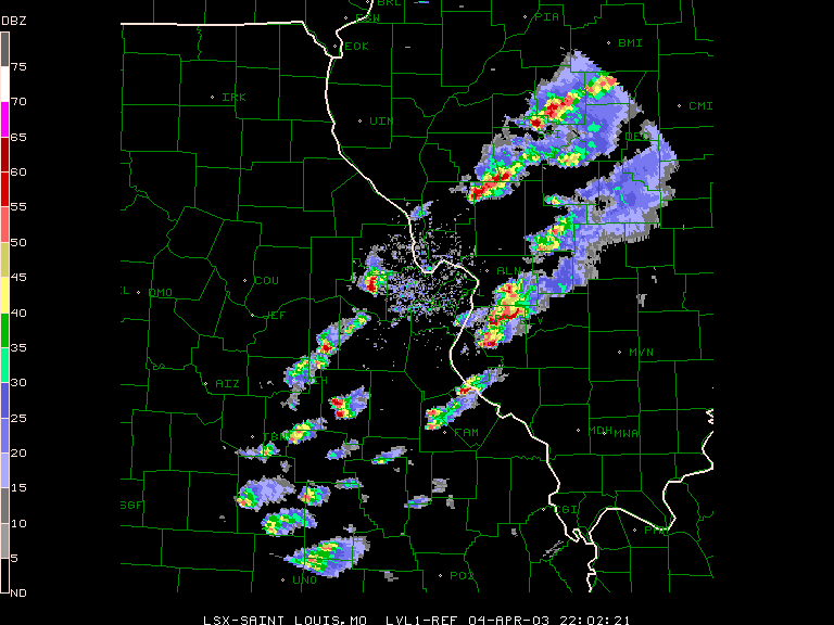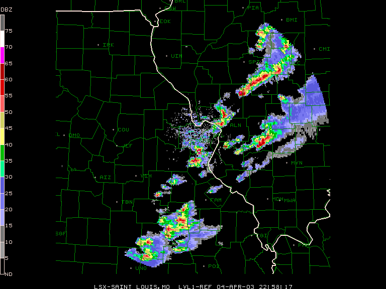 Now, the storm was evolving rapidly into a squall line. I stopped for a quick pit stop at the rest area near the Taylorville exit, and there were several people who had driven through the storm who were really freaked out by what they had come through - intense hail and low, rapidly moving clouds. Some thought they had seen funnel clouds, but if so, that must have been farther north. I watched the storm passing to my north, and though becoming more linear, it remained intense, as can be seen on this radar image from just before 5 p.m. Note also on this image the very intense cell in Clinton Co., to the ESE of the St. Louis area. This cell, associated with the cluster that passed just south of Edwardsville, produced a tornado near Bartelso, IL minutes after this radar image was captured.