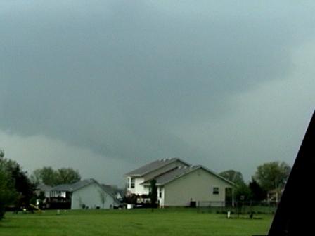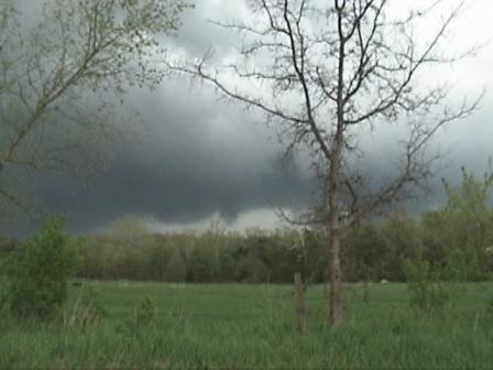 By the time I reached Millersburg, it seemed apparent that the storm was turning to the right a bit, based both on the reported positions in the warnings I was hearing and my own visual observation of the storm, which from this angle seemed to be producing widespread rain between me and the reported location of the meso. I decided my best bet was to go as far south as I could on J, to get east of the meso's reported location approaching Ashland. Should I end up too close, there were varous eastward escape routes along the way. However, at this time I made an annoying navigation error, following route F rather than route J where the two split. By the time I figured this out, my best recovery plan was to continue on to route 54, then go SW toward the path of the storm. By the time I was due east of Ashland, it was obvious that the storm had continued its rightward path and was now moving toward the SE or ESE (though the radar reports still described it as moving east). I could now see a ragged, scuddy area under what was apparently the meso, through the rain at first, but then I got an occasional clearer view through gaps in the trees. I also noticed (and heard reports on the radio) that other storms to the SE of the one I was targeting had intensified rapidly, to the point that my storm and a couple to its SE were beginning to interact. I exited route 54 somewhere around Lake Mykee - I think at route AE between New Bloomfield and Lake Mykee - and turned right (north) on AE (I think) at the T intersection I immediatedly encoutered after exiting. There was a hill there that would allow me a better view, and when I got there I could see the ragged, scuddy meso off to my WSW. I was actually sitting next to a radar of some kind; perhaps a TV radar? About this time, a TOR warning was issued at 4:40 p.m. for southern Callaway Co., right where I was, based on radar indication of strong rotation 7 miles NW of Holts Summit. Obviously this was the meso I was watching, as my location was about 6 miles NNE of there (if I was where I think I was). Also, minutes before the TOR was issued, the storm produced golfball hail 3 miles south of Ashland along U.S. 63. In addition to the meso to my WSW, I noticed a very strong and low updraft base to my south from the next storm SE.