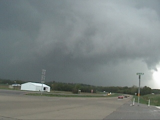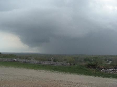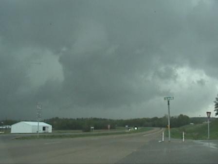Gradually, the meso came closer, but did not show any indication of being about to produce a tornado. Still, I did not want to let it pass right over me (or just to my south, which would put me in the hail core), so I knew I needed to bail south. I turned around on the road I was on and did so; fortunately the road was just in the right place to let me thread my way toward the small bright spot between the updraft of the storm to my west and the rapidly intensifying updraft of the one to my SE. Somewhere around or just south of Lake Mykee, I think a little before 5:00 p.m., I stopped again and watched the meso, which was both shifting to the SE and changing in form to look less like a wide wall cloud and more like a shelf cloud as precip began to punch in behind it. It did, however, have a very impressive inflow tail at its north end. I did not catch the locations, but a SVS at 4:48 placed the radar-indicated tornado near New Bloomfield (where I had just been), with a new tornadic radar signature on the next storm SE, near Wainwright. The latter was described as moving NE and the former continuing to the E, so it was a matter of time until these two storms merged. Soon I moved south once again, stopping a mile or so south in a parking lot. At this time the meso was almost over me, and I noticed a small area of weak rotation in the clouds perhaps a mile to my W. I got a little more video, including this shot of the north end of the lowering almost overhead, then bailed to route 54 and ducked south to get out of the path of any possible wrapping hail. At 5:10, another chaser reported golfball hail at Lake Mykee, where I had been minutes earlier.