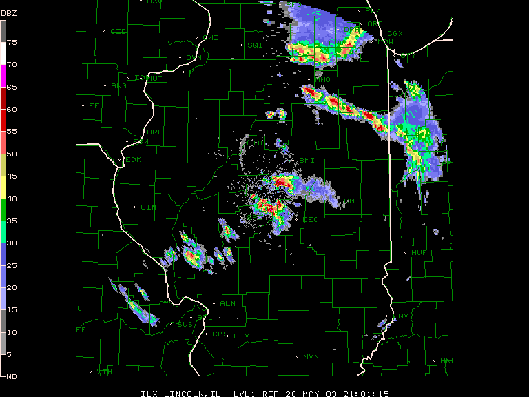 By the time I reached Litchfield, I had heard about a blue box for Sangamon and Christian Counties and points north. I stopped briefly at the rest area near the Taylorville exit and checked radar on the DTN system. The cluster of storms SE of the Quad Cities had now morphed into one monstrous storm that looked supercellular and looked to be near or just NE of Peoria. The Springfield NWR was reporting the strongest storms near or just west of Peoria. By the time I got close to Springfield a little before 3, I could see lots of towers and anvils to my north and NW. By the time I was most of the way through Springfield, I could see I was getting close to one of the storms as the sky to my northwest was becoming very dark, and I could see some updraft base off to my NE. Hearing no warnings, I decided to see what was going on farther north and managed to tune in the Peoria NWR - and immediately heard an update on a TOR warning that had already been issued for Tazewell and Woodford Counties, based in part on an actual spotter report of a tornado.
