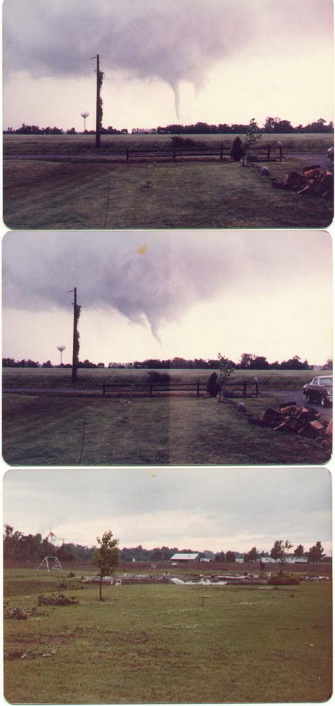 Marion, Illinois Tornado - The May 29th, 1982 Marion, Illinois tornado. The top photo in this set of 3 photos is looking east toward Marion. The tornado is near the intersection of I-57 and Route 13. The middle photo is from the same location and the bottom photo is of a home, just moments after the tornado completely leveled it. Keep in mind, this picture was taken before anything had been cleaned up --there was nothing left, except foundation. In this photo, the tornado has widened. This tornado was rated F4 and caussed 10 fatalities and many injuries. Photos by Brent Beasley.