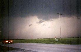 I headed south on 4 to 143, then headed west the few miles to my home on the east side of Edwardsville. I could see nice towers going up ahead, as the line continued to build south. As I headed west on 143, I realized I was back in the inflow, and a couple miles before I crossed I-55, I got a real blast from the south of inflow racing into the backbuilding storm to my north. I looked that way, and saw a small lowering with lots of scud around it. In front, a scud tag moved from the left to the right. Was this scud cluster rotating? Naw, I told myself, in what may have been a big mistake. Probably just outflow pushing the scud tag along. I continued home, thinking 1) this was just another meaningless scuddy lowering like other small, meaningless, scuddy lowrings I'd seen all day, 2) I had to get home because of my commitments, and 3) the storm building to the west would chase me east or force me into a core-punch if I stopped now.