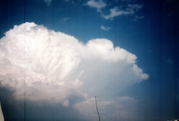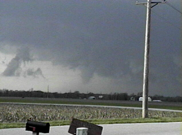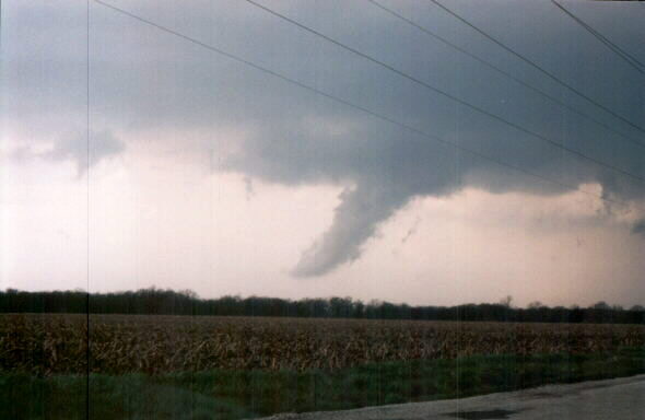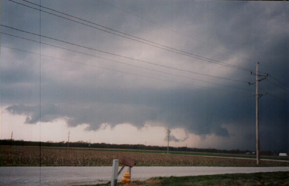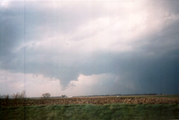 I drove up I-55 to the Litchfield exit, watching the cell come into view well to my west. About 10 minutes after I left home, the STL NWS office issued a severe t-storm warning for northern Jersey Co. for this cell. Movement was NE at 25, so it shouldn't be too hard to catch up and keep up with. There was also a smaller and weaker but strengthening cell closer to my SW, probably not too far from Edwardsville. By the time I neared Litchfield, the Jersey Co. storm was looking good - anvil being carried off far to the NE, and a hard, vertical tower at the storm's SW edge. I was a little north and well east of the updraft now, so I turned and headed west on IL route 16. By this time I had lost the STL weather radio station, so I put my AM radio on KMOX. A few miles west of Litchfield route 16 turns SW, but you can continue west by turning onto 1200 N. at Hornsby, which I did. I thought I could take that to route 4 and turn north toward Carlinville. As I got more west I tuned in the weather radio and got the STL station again, and found out that another tornado watch had been issued covering much of the remainder of southern Illinois not covered by the earlier one, including Macoupin Co. where I was located and points east. As I approached route 4 the storm was looking better and better, becoming more backsheared. When I got to hwy. 4, I decided to continue west rather than turning N., since the storm was still a ways to the west, with the updraft just a little farther south than my location. I was still facing bright sun as there was little or no flanking line or any other cloud structure to block it out. When I reached 1600E, which is a curving north-south road almost due S. of Carlinville, I decided to turn north. As I got closer to the storm, I got the first good look at its rain-free base, which contained some small lowerings. I continued north until I found a good place to stop about 4 or 5 miles S. of Carlinville. Going north I lost the weather radio station, so switched back to KMOX.