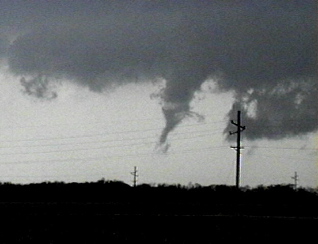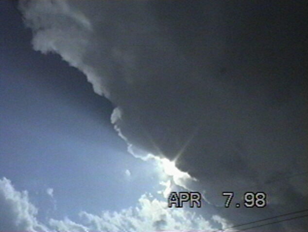 As I got out, I was blasted by inflow from the SE as I stood in awe of the spectacular storm structure before me - classic supercell structure. The anvil was now very backsheared, and towered above me. A wide wall cloud formed out of the lowerings under the main updraft, with inflow tails on both ends. CG lighting zapped down in the dense precipitation core to my north. I took photos and started to tape as some interesting lowerings extended from the wall cloud, only to realize after about 5 minutes that my camera was not taping - in my efforts to freeze the focus at the maximum distance, I had frozen the whole camera. I had to turn away from the awesome storm to deal with this bit of technological incompetence on my part, but after a few minutes finally solved the problem. With all the excitement I forgot to check the time, but it had to be around 4:20 or 4:25 when I arrived at that location. I watched, photographed, and videotaped the storm for 20 to 30 minutes. Toward the northern end of the wall cloud, I saw a needle funnel which persisted about 50 seconds. Here is a video snap of this structure just after it appeared, and here is another from about 30 seconds later. Toward the southern end of the wall cloud, some slow rotation became evident at the time of this shot. Toward its northern end, what appeard to be a much larger, wider funnel formed, though it was hard to tell for sure as this structure was slightly rain-wrapped. Here is another, more zoomed, video snap of this apparent funnel, with a possible slight RFD notch forming on the left. This lowering reached more than half of the way to the ground. Another narrow lowering formed near the southern end of the wall cloud; it reached almost 2/3 of the way to the ground. Its shape appeared to be that of a funnel but I could not verify rotation and it did have some discontinuities; after about one minute it appeared to rope out and disappeared. The whole time I watched this storm I was blasted by inflow from the SE that I would estimate at 20-40 mph - it is the main sound you can hear on my video. As more and more of the lowerings lost contrast as the storm got farther NE so the rain area was behind the lowerings, I knew it was time to move northeast.