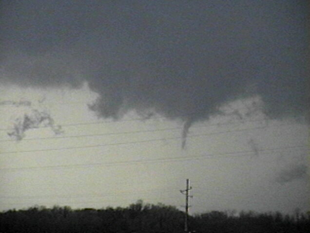 As I got in the car, KMOX was finishing up the process of announcing a tornado warning for Macoupin Co. - my storm! As the warning below indicates, St. Louis NWS had a TVS about 5 miles W. of Carlinville at 4:45 - the approximate location of the apparent large, partially rain- wrapped funnel I had seen. My only way northeast was to proceed into Carlinville and then head east, which I did, on IL route 108. Now the storm had gotten ahead of me and was both north and east of me - it seemed to be moving faster than before, which is confirmed by the NE at 35 movement indicated in the tornado warning. I figured I could head east then catch up with it by heading up I-55, but there was one problem with this - it was now about 5:00 and I was supposed to meet someone in Edwardsville at 5:30. I grabbed my cell phone and cancelled that. As I headed east, yet another lowering formed under the updraft which was now to my NNE. This may have been the most impressive of the day, a narrow lowering that reached 80 percent of the way to the ground. I could not verify rotation, so I would classify it as a "likely funnel" based on its appearance, but cannot say that with 100% certainty. In any case, it was every bit as awesome as it appears in the picture. I did not hear it at the time, but I found out later that, around this time, the Lincoln, IL NWS office issued a tornado warning for Southern Sangamon and northern Christian Co. based on a TVS around this general location. The lowering got shorter but wider, and to its right, too far away to see well, was what appeared to be a front-lit lowering extending almost to the ground. It appears as a lighter colored lowering on the right of the picture. However, given the rapidly increasing distance between me and the storm as it got farther and farther to the north of me, part of the latter formation could have been a sunlit rain or hail shaft. By now, I was in anvil rain from a rapidly intensifying storm to my SSW. Both to avoid getting hailed on by that storm and to try to catch up with the other one, I headed north on I-55. But the storm had too good a lead on me, so I gave up after two exits. By this time all the lowerings had disappeared, but the storm had developed what may have been an RFD notch. But seeing no more lowerings and being well-behind it, I gave up, as I was really needing to get home because of evening commitments.
