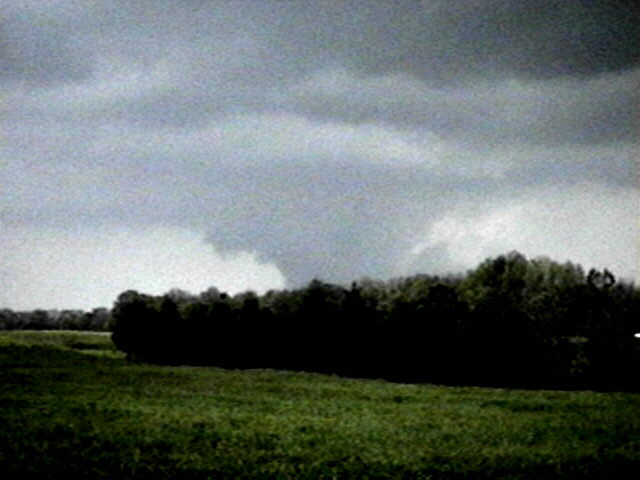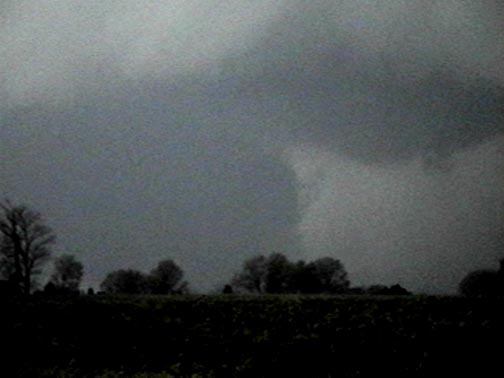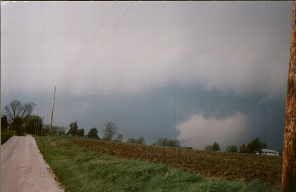 I was in position about 3 miles south of Red Bud, which appeared as best I could see to be east of the storm with a good escape route south, by around 5:30 or so. Around this time another tornado warning was issued based on a radar TVS near Maeystown. As the storm moved toward me, I saw a beavertail on the northeast of what turned out to be the updraft base, extending northeast toward the precipitation area. As the RFB approached me a huge wall cloud became evident. Here is a video snap of this feature, and here is a photo. Some of this lowering was due west of me, so I backed maybe 1/3 of a mile farther south. At that stop - about ten to 6:00 - I saw and videotaped a huge rotating wall cloud that extended almost all the way to the ground (appeared to go all the way at times) and at one point appeared to throw up a cloud of dust or debris - I saw it at the time and can see it on the video. This may in fact be dust or debris, indicating a tornado, or it may be very low scud or hail fog being drawn into the vortex. Jay Antle was viewing this lowering from the north and reports seeing hail fog drawn into it. Whether that was at the same time as I was seeing this or slightly later is not clear. He felt that when he saw the lowering, the wind strength was not strong enough to classify as tornadic. There is also a flash of light - looks like a power flash but could be lightning - in my video at one point in the location where the lowering is closest to the ground. At about this same time there was a spotter report of a tornado near Red Bud, which prompted a warning from STL NWS. (Actually, there were reports of brief touchdowns both west and east of Red Bud.) On the NWS STL local storm report a tornado is reported as briefly touching down 10 miles SE of Waterloo, which would place it about 3 miles W or NW of Red Bud. I was about 3 miles S. of Red Bud looking NW. Based on the possible debris, possible power flash, spotter report, and minor damage I later saw (discussed below) I am classifying this as a "possible tornado," but I would like to emphasize that I am not completely sure about this.