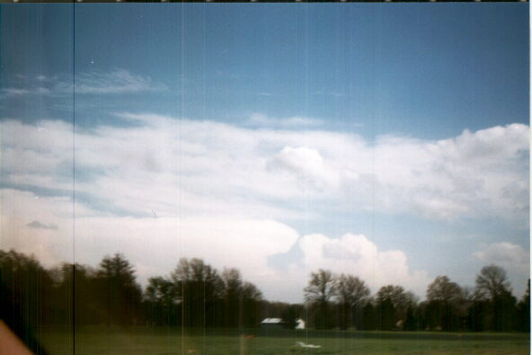 I returned to 16 and proceeded east to Gillespie, turning south on IL 4 there to get a view of the storms to the south, which were continuing to generate warnings and reports of severe wx in the STL area. It was evident that I could not continue south without core-punching one of the storms, so I turned west on IL 138 at Benld hoping to get a view of the storm as it passed to the SE of me. I stopped a couple miles SW of Benld and watched the storm to my south for a few minutes. Before long, I determined that there was no way I was going to see much of this storm, because it was too obscured by rain. At the same time, I noticed that the flanking line I had been watching had put up two very hard, high towers that had begun to glaciate, one to my WNW and the other to my NW. I looked at the base of the one to my WNW and noticed a very substantial lowering, a wall cloud reaching perhaps halfway to the ground and tailing off to the southwest. But I could not see it well because it was quite hazy, and the storm was 8 to 10 miles away. Of course, had I stayed with the position I had been in earlier on the state park access road, I would have had a great view of this storm (probably would have had to retreat a little to the SE to get out if its way). Anyway, it was obvious this was the storm to chase so I returned to IL 4 and headed back north toward Gillespie. As soon as I was on 4 a tornado warning went up for Macoupin county, with a doppler-indicated tornado about 10 miles SW of Carlinville moving NE. This could have been in either of the two storms I was watching, but from the location reported I'd say it was more likely the same storm that was producing the wall cloud. As I went north into Gillespie, I could see a very distinct wall cloud and several small lowerings that may have been brief funnels. This would have been sometime around 2:45 p.m. But of course I was in town stuck behind a 5 mph hay wagon (do mesocyclones cause these?) so I could get only occasional glimpses of the storm, taking pictures out my window when I could. But the storm was still six or eight miles away, so my view was not good.