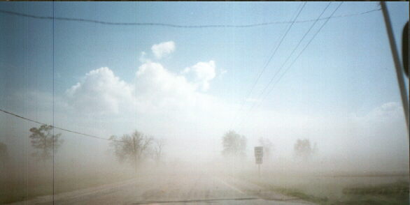 As I headed back toward Edwardsville in a sunny sky, I could see awesome towers to my NE, E, and SE, some with overshooting tops and backshear anvil. As I approached Gillespie from the north, the closest storm directly to my east, perhaps 10 to 12 miles away, developed a large wall cloud. Overall, this was a very impressive batch of storms, all individual cells rather than a squall line. On the way back I ran into winds behind the cold front, which was very close behind the storms. These winds were clocked at 50 mph in STL and 74 mph in Springfield, IL, and caused scattered damage and numerous power outages throughout the St. Louis area and much of Illinois. And since it had not rained in the area I was passing through, I also encountered the most awesome dust storms I have ever seen in Illinois. Visibility down to zero at times, with corn shucks blowing out of fields and pounding my car like hail.