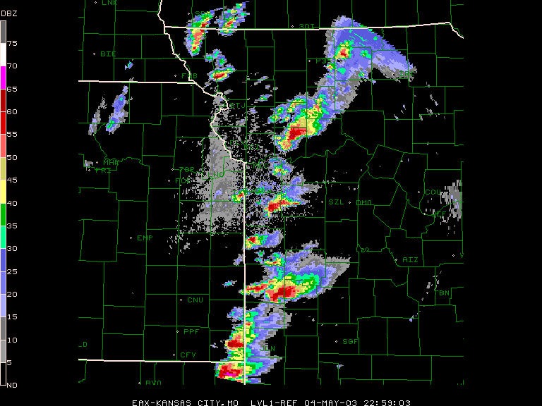 A damage survey from NWS-EAX for the first Johnson-Pettis storm can be found here, and a map showing the tornado tracks and times, with my positions and times shown in blue print, can be found here. A listing of local storm reports from the Kansas City (EAX) NWS office is also available.