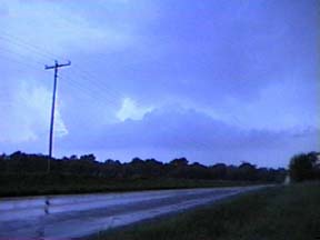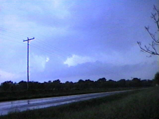 Now the storm began to rapidly weaken and shear apart, and I could see a second storm, which now was SVR-warned, coming behind it along more or less the same path, out of Johnson Co. and into Pettis Co. So I blasted a few miles south on 65, turning west on route D past a police car and a few chasers, and went maybe 3 or 4 miles. This storm, the best of the day for me, had a lot of in-cloud lighting, and displayed a narrow updraft and beavertail to my SW. Finally, some interesting storm structure that I could actually see! The rain and hail core was on the right side of this video capture, and farther to the right off the picture was a sort of a shelf-cloud feature. As shown in this video capture - an updraft rapidly formed in the beavertail structure, which soon merged with the parent cloud above it and became the main updraft. An intense rain and hail shaft formed just behind it, as seen here minutes before I bailed east to avoid the hail. Around this time, dime-sized hail was reported in Houstonia, just to my NW. I stopped again a mile or so east to watch the storm as the meso passed less than a mile to my north, and that proved to be a little too close, as the storm tossed out some dime sized hail to my location. Fortuantely, it wasn't much, and once the storm passed, that was about it, as it was really accellerating off to the NE. I called it a chase and headed north, got gas, and got on I-70. I had the storm in front of me all the way to Columbia before I caught up to it again, but it steadily weakened and pretty much died by the time it and I reached COU. The rest of the trip home was an awesome show of in-cloud lightning and some spectacular anvil-crawlers, both from the supercells to my south that produced killer tornadoes in the Ozarks, and from a fast-moving squall line that had developed west of STL. Arrived home around 11:30 in light rain on the back side of the squall line; total distance for the day was 550 miles, rougly 180 more than if I had taken the direct route home. So we'll call it 180 chase miles.