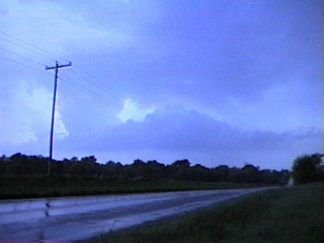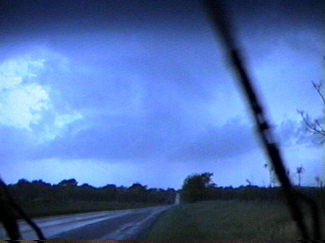 Given this, I blasted south on 5 to Milan then west toward Trenton. I was beginning to hear reports of tornadoes in the Kansas City area and of a strong storm SW of Warrensburg, MO. By the time I got to Trenton I had been hearing reports of a large, destructive, long-track tornado in the KC area, and determined that I could cross ahead of the storm heading south on U.S. 65 from Trenton through Chillicothe, and perhaps intercept it west of Carrolton. As I headed toward Carrolton, I continued to hear reports of the storm in Ray Co., still reported as having a "large, destructive tornado." I got to Carrolton around 6 and blasted west on route 10 toward Richmond, where the tornado was reported to be, moving east. Soon a TOR warning was issued for Carrol Co., with the tornado expected to reach Norbonne by 6:25. Like all day, I remained in low-visibility gunge, and I had also been in anvil rain since about Trenton. I arrived at Norbonne at 6:15, found a good viewing spot just south of town where I could easily return east if I had to, and waited for the show to arrive in 10 minutes. 6:25 came and went with no show. Finally around 6:30 I could see ragged, scuddy RFB to the northwest, and heard an updated report indicating the area of rotation passing about 5 or 6 miles to the north - farther than you could easily see in the rain and gunge. I headed through Norbonne and tried to go north, but got stopped for 5 minutes by a train. By the time I finally got to the top of a hill where I could see something, I could see the meso, looking very rain-wrapped and occluded, perhaps 5 miles NE. I was right under the flanking line/gust front SW of the storm, and could see some violent motion in the clouds, but no lowering and it looked very outflowish in my area. At that time, thet WX radio announced that the TOR warning was cancelled because the storm had weakened.