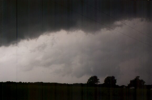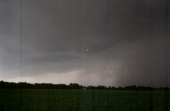 1:40 - After skirting the eastern edge of an obviously-stronger storm, I clear the precipitation to see a nice updraft base just SW of a very heavy precipitation core. I stopped to watch, photograph, and videotape what now appeared to be a severe storm from about 5 or 6 miles south of Woodlawn, IL (just west of Mt. Vernon). The storm now was producing almost continuous lightning, close enough that I got out of the car only long enough for quick snapshots and videotaped mostly through an open window from inside the car. (This thing went from no static on AM radio to nearly continuous in less than half an hour.) Very soon after I stopped, I heard a severe thunderstorm warning on this storm, with Paducah Doppler indicating a severe storm near Woodlawn. There were a few small lowerings, including this one, which I thought at first might be a developing funnel cloud. It had a nice clear slot in front of it, which added to my thinking of what might develop. However, it dissipated very quickly - never really got its act together. After a while, the storm was getting away from me and it was time to move. I returned a few miles north to highway 15 to head east a few miles toward Mt. Vernon. I noticed leaves stripped off trees along IL route 15, near where I turned off the north-south road. This led me to suspect there had been large hail, though none was visible on the ground. Later, when I saw the LSR on this storm, I saw that indeed there was - 3.5 inch hail had been reported in Mt. Vernon at 2:10. I paused when I got to Mt. Vernon to try to decide what to do - continue in pursuit or drop south hoping for an other storm in the better instability farther south. I decided on the latter because it was increasingly evident that catching this storm again was a lost cause - it was rapidly getting away as it moved off to the NE. The town of Mt. Vernon was in the way, and it would have been long gone by the time I drove through town. I thought about heading north on I-57 and cutting east to catch up with the storm, but there was no exit for some distance north according to the map. Time to drop farther south and hope for another storm.