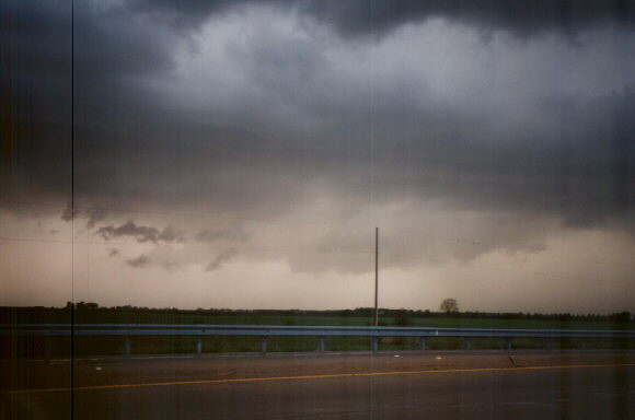 I put the car radio on AM to see if there was any storm static. There wasn't. Gradually I catch up with the storms, and pass through light rain between two weak cells; the one to the south appeared slightly heavier. I exited the freeway and headed south through the town of Woodlawn to work my way down the line, hoping the tail-end storm might strengthen. An occasional burst of static could now be heard on the radio. By 1:20 I was in the town of Woodlawn looking west toward a break in the line - scuddy updraft base. I was now starting to notice a considerable increase in the amount of static on the radio, and the sky to the southwest was darkening. I proceeded farther south on the same road for a better look.