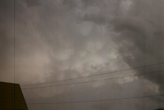 6:45 - I watched a beautiful backlit wall cloud on a storm between Collinsville and Highland. NWS STL had issued a SVR for this storm or for another just to its NW. After 5-10 minutes the wall cloud occluded, and I proceeded into Lebanon and turned north on IL route 4. I followed that toward an impressive-looking storm that appeared to be somewhere near New Douglas. Both this storm and a line of elevated storms to the northwest were putting down quite a bit of CG lighting. At the southern end of the line of elevated storms was a wall cloud-like structure, except that it was elevated. I was surprised to learn later that these elevated storms triggered warnings from Sangamon Co. well to the northeast, and produced some reports of large hail. But it was now getting dark, and the chase was over. I stopped and gassed up at Hamel and headed back down I-55 to Edwardsville. Some mammatus clouds on the back side of the storms to the east were beginning to be sunlit.