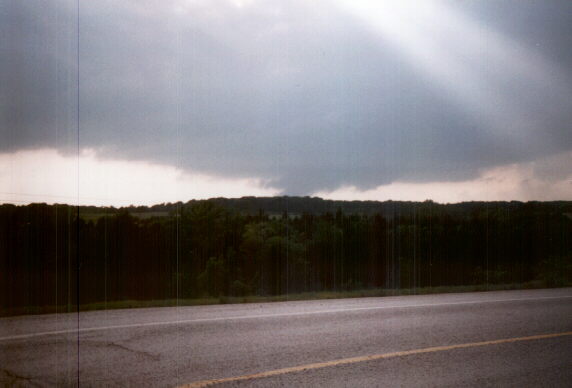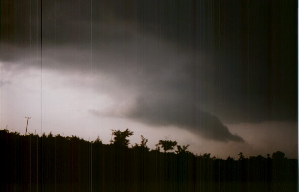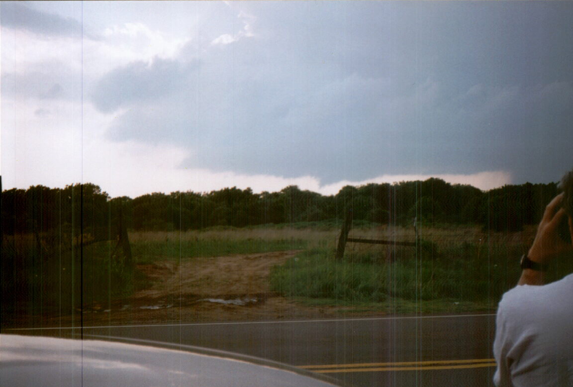 As soon as I did this, I was both pleased with my decision and annoyed with myself for getting so absorbed in the radio reports that I didn't look carefully at the developing storm to our northwest. It now had a high, slightly backsheared anvil, with a rock-hard updraft tower underneath! I said "that's our storm!" and after we passed through Dilton, I could see RFB to the west, brightly backlit and orange underneath from the lowering sun behind the storm. Ahead was an area of heavy precipitation. Before we were back to 51, I could see a lowering beginning to form, and by the time we crossed 51 there was a definite wall cloud. Since the meso was clearly moving north or northeast, I wanted to stay headed north on 99. The area was hilly and wooded, so we could not stop as soon as we liked. But about halfway between 51 and Jennings, we found a nice open spot where visibility was fairly good, so we stopped to watch, photograph, and videotape around 6:20. By now, there was a narrow lowering halfway to the ground, and as I started to tape, I announced "We've got a funnel." After looking at the tape I'm not so sure, because I cannot confirm from the video that there was any rotation at this point, though there was later. Hence, I'd classify this only as a "possible funnel." Alice took an excellent picture of this feature showing the lowering, the updraft tower above it, and the intense precipitation shaft to the right. I do think we had several brief funnels over the next 20 minutes or so, and we certainly had an awesome series of brightly backlit wall clouds, which at times were definitely rotating. The storm produced a series of three wall clouds, the first two of which rotated at times, and also reached two-thirds of the way to the ground at times. The shear was very visible - the base of the meso was moving almost due north, while the downdraft area moved to the northeast and (as later viewing of satellite photos confirmed) the anvil blew off to the southeast, eventually reaching Arkansas. In fact, our ability to move closer to the meso was limited because it was making northward progress faster than the precipitation core, which I obviously did not want to drive into for fear of large hail and because of lost visibility. This shearing process resulted in the wall clouds getting split off from the core, only to have new ones form closer to the core. We watched and taped for about 10 minutes at our first stop, and for the first 2 or 3 minutes both of us noticed a steady loud roar (you can hear it on the video, too). I have always associated this sound with a tornado on the ground, which this was not - can violent motion in a wall cloud or funnel cloud also produce this sound? (Or could this have been the same kind of "hail roar" that was observed the same day by Roger Edwards on another storm much farther south?) It definitely was not thunder, though we did get occasional thunder from CGs in the precipitation shafts to our north.