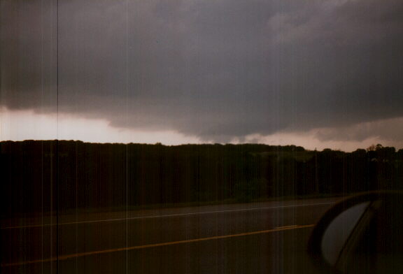As the meso moved north, we moved to a new position just north of Jennings and taped the second wall cloud. It was very wide and solid at times, and appeared to reach the ground - looks like a large tornado in this part of the video. However this was an illusion caused by a hill to our west. As it got to the north of this feature, we could see that there was still a gap between the lowest part of the wall cloud and the ground. At this point, the video shows clear rotation. Around this time, I paused briefly from videotaping to take this picture. In a few more minutes, the wall cloud began to get shallower and shallower until it was indistinguisable from the base. After about 10 minutes at this location, we moved north again to where 99 passes over the turnpike, and stopped again. A new wall cloud formed, but I soon noticed that what had been an intense precipitation shaft had now dwindled down to nothing. This wall cloud was under a towering cumulus that was producing little or no precipitation, as the anvil and any lingering precip underneath broke off to the southeast. We followed this third wall cloud, which never rotated so far as we could see, to the north to where 99 joins 64. We followed these roads east into Cleveland, where we decided to stop and grab a quick sandwich at a Subway shop when we arrived in Cleveland at 7:15. The wall cloud had nearly disspated, and the towering cumulus had not substantially glaciated. The whole thing appeared to be weakening. Since it had only moved about 15 miles to the northeast in an hour, we figured we could easily catch up with it if it regenerated. (After the Illinois storms I'm used to chasing, this slow movement was a real joy!) It briefly looked like it was going to regenerate, but by 7:30 the whole cloud had disappeared. We did now see a spectacular storm far off to our northwest. But I knew we couldn't get anywhere near it by dark. The chase was over.