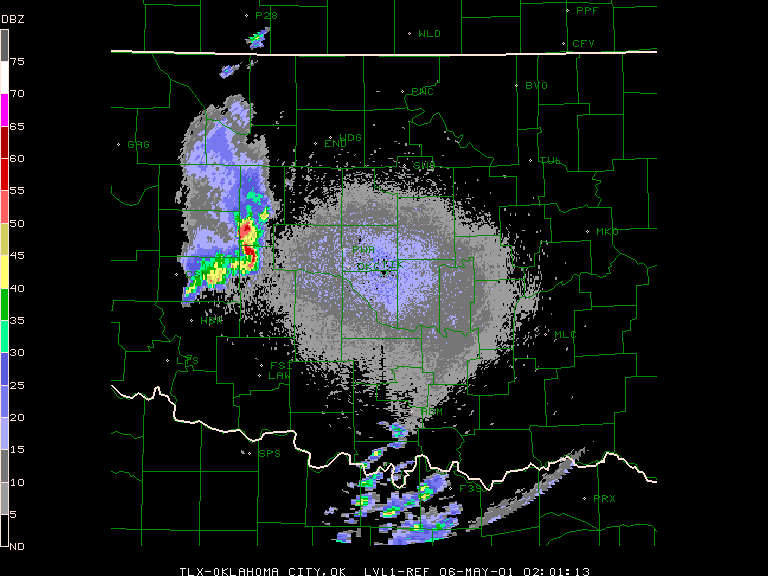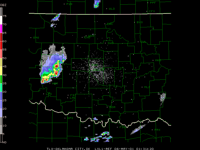 8:30 – I briefly chat with fireman as I turn east. He says he saw tornado and is debating closing the section road I have turned on to, but decides it is safe. Spotters have reported tornado 6 NE of Cordell at 8:23. As I head east, I hear that the storm just S of Cordell has intensified and now capable of producing tornado. I have noticed quite a bit more lightning to the S in the past 10 minutes or so, and as it is getting dark, I decide to work back to the main road and head north to Clinton for the night, rather than chancing getting caught by the next storm. New TOR is issued for Custer Co. as the storm is moving out of Washita Co. and toward the town of Weatherford.