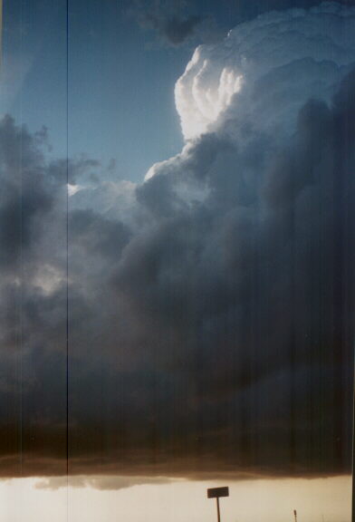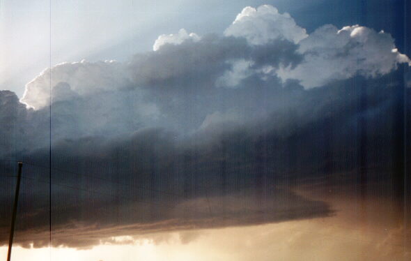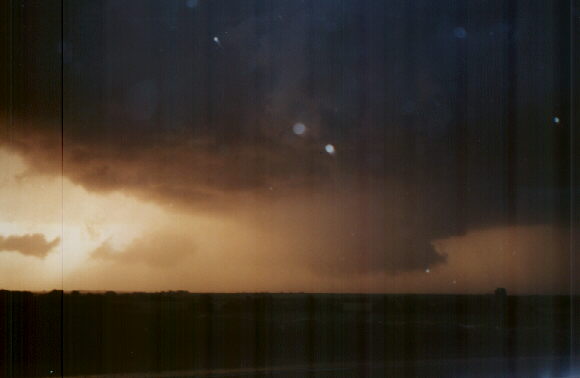 7:25 – Very nice beavertail visible – have been watching it for 20 minutes now. The beavertail looked like this when it first appeared and grew to this in about 20 minutes - very impressive! Storm has produced one small wall cloud and various scuddy lowerings, and these were showing slow but noticable rotation. Towers have been rock-hard since about 7 and are now going higher. But only a little lightning and not a lot of precip – storm looks LPish. Lots of chasers watching storm.