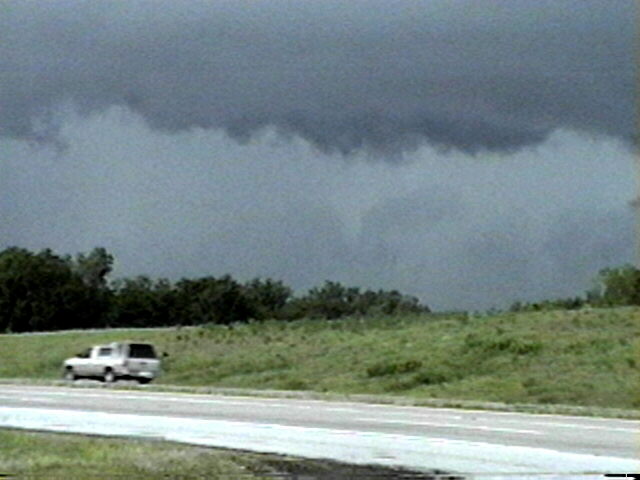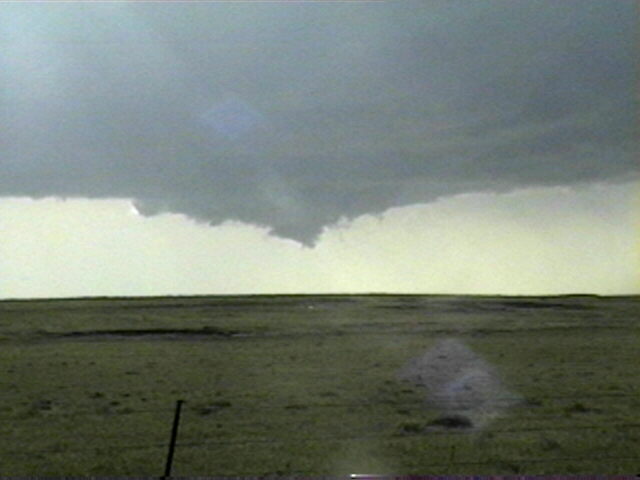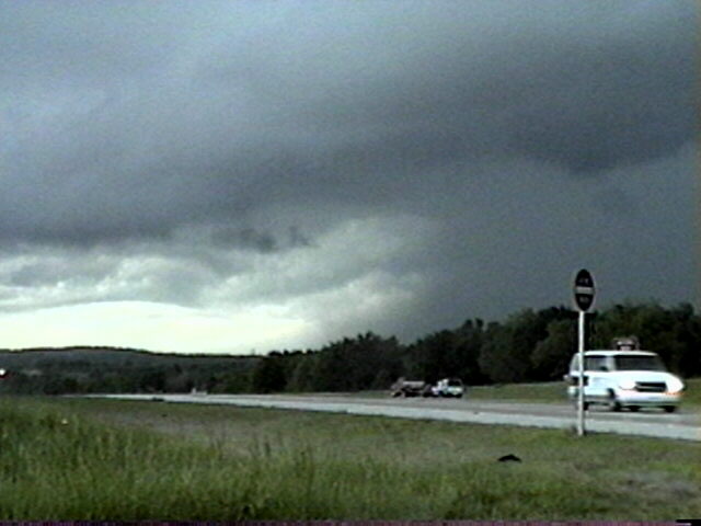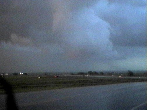 8:20 – By the time I'm thru town and have clear view, I can see the now rather wide wall cloud and a lot of scuddy lowerings nearby and under it. Concentrating on these larger lowerings, I miss seeing the small, needle-like tornado this time, but may have managed to get it briefly on video again (I am somewhat less sure about this now than I was the first time I looked at the video, though.). Spotter reports indicated that the tornado touched down briefly, then re-formed; I think this may be the redevelopment. After reviewing Scott Axelson's report and pictures , I am more inclined to think this is the case. His report (linked below) indicates two distinct tornadoes, and his pictures from the opposite direction show many of the cloud features in the positions they would be looking from the opposite way. After looking at my video repeatedly, I see what appears to be a scuddy lowering that evolves into or rotates around a funnel. In any case, here is a video capture of this feature; note what appears to be a pinkish funnel protruding in front of darker cloud base as the sun front-lit it. During most of the lifecycle of the tornado, the condensation did not reach the ground, though numerous spotters and chasers in better locations than mine confirmed that the circulation did. As I leave this spot to pursue the storm, I experience the only real chaser carelessness I saw as one person pulls onto road right in front of me. For the most part, though, the many chasers were considerate and did not block roads, stop unsafely, etc.