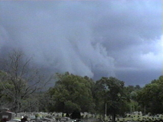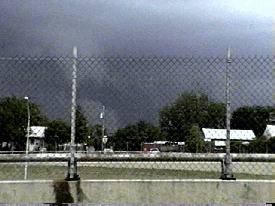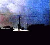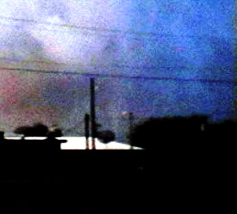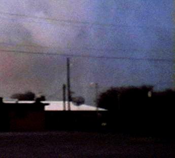 8:15 – As I pass thru Cordell, chasers converge from every direction to chase N. I pull over for a moment as a police car with sirens blaring speeds toward the reported tornado. My plan had been to head east from Cordell, and had I done that, I might have gotten a better look at the tornado. But I foolishly went with the crowd of chasers blasting north. As I am near the center of town, I see a pinkish, funnel briefly - I think this was the upper part of the tornado; the lower part hidden behind trees and buildings. I stop again briefly in a parking lot in town and shoot some video, but at this time I cannot spot the tornado again. However, upon later reviewing my video, I have discovered that I did indeed get the tornado briefly on video at this time! The contrast is very poor, but the tornado can definitely be seen in this video capture. It is above the sloping part of the white roof, between the two poles. Here is an enhanced version of the video capture - it's more grainy, but the tornado is easier to see. Sometime while I was in the town - can't recall exactly when, a second or continuing touchdown is reported about 4 miles NNE of town.