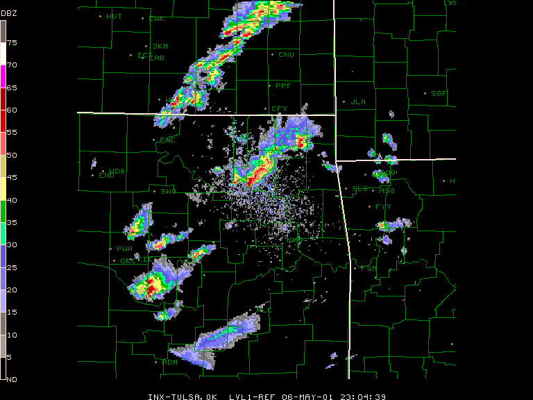 2:15 - I blast back W to Okema, then on 62 NW to 48. I see a lot of darkness and some anvil spreading over the sky to the west, and other storms firing to N and far NW. I double back and forth a couple times on 48 and W to Gypsy. Finally after an hour or more of indecision, I realize that the storm to my SW is still far away. (Actually, it turns out it was all the way back near Norman.) With lousy visibility (woods and hills) and poor road network, I can't go to it, and if I wait for it I will be there a long time. Meanwhile, I see a very impressive cluster of storms up near TUL and am hearing SVR warnings for Osage Co. I decide to commit to these storms.