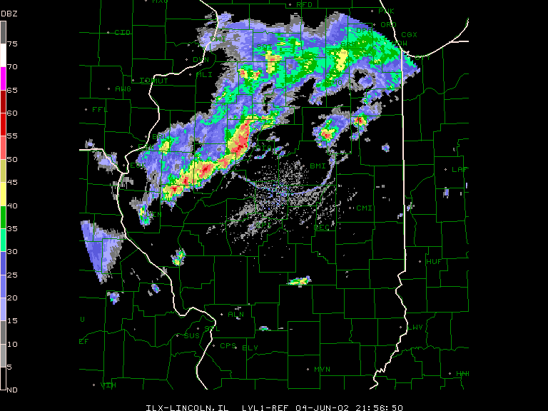 Here is a radar image from 5:00 p.m. as the storm is going severe west of Peoria. A few minutes after this, 2-inch hail was reported near Bartonville, just W of Peoria. Here is a radar image from 6:00 p.m. By now, the line has surged dramatically east and SE, with the most severe part of the storm near the northern end of the bow echo, near El Paso, where .88 inch hail was reported about the time of this radar image.