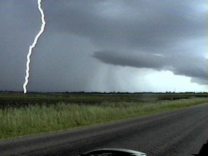 6:50 - Now I see the strong storm ahead, so I exit at Elkhart. I briefly watch a rainbow to my east, then see an odd cloud feature under the updraft of the storm to my SW. It is pretty solid and looks a little like a wall cloud, but it is not attached, and never becomes attached, to the parent cloud above. The part closest to the core is cumuloform and boils up toward the updraft base above, while the part farther away is more stratiform looking. It develops a small inflow band on the side toward the storm, as CG intermittently zaps down in the nearby core. It also seems to gradually widen with time. Occasionally what appears to be hail shafts can be seen in the core near this feature. Here is a picture of this feature.
