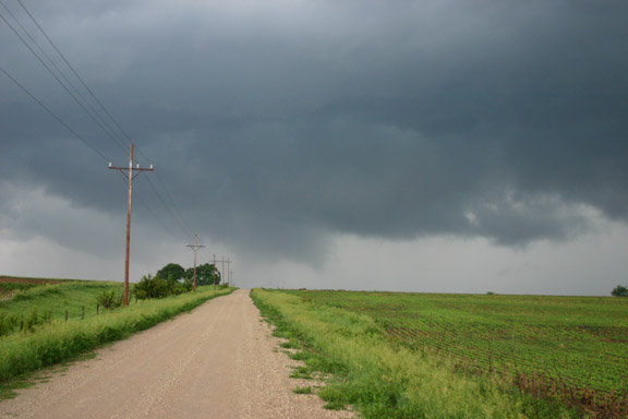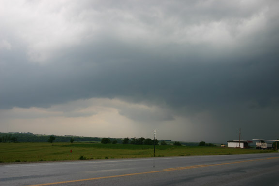 I cut west off 75 on 16, then realized I needed to get north and headed up through Soldier to about 4 miles SSW of Goff. I stopped a few times to view and video the storm, which was looking supercellular and was SVR warned. I saw some small lowerings at the location SSW of Goff; there I met up with a tour group whose leader kindly let me look at the group's live radar, and warned me about the "larger than golfball" that turned his group around a few miles north. (Sorry, I did not get which tour group it was.) This really was the first chaser convergence I encountered, and one of only two that involved at least 3 vehicles - I think the numerous storms all over the place kind of scattered the chasers so the feared massive convergence did not occur.) He also mentioned that the cell off to the NE was tornado-warned, and I had heard a SVR warning also for the next storm down the line to the SW. But I could not get to the NE storm now (in fact it was about this time that it produced the tornado) and the storm I was on looked too good to abandon for the next one southwest, which I figured I could always easly get back to anyway, given the northeastward movement. So, I waited until I was confident the storm had passed Goff, then headed through Goff and back to 75 for the intercept near Sabetha.