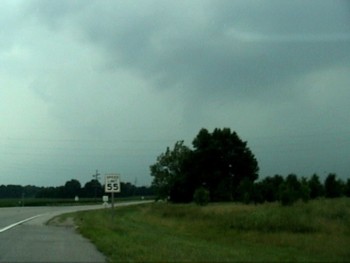 By the time I got there, a new TOR warning had come out for a cell to the south, with rotation near Eureka, MO. I changed strategies and decided to intercept the new storm around the Columbia, IL area, since this southern storm would get more unsbable inflow and seemed to be merging into the northern one. Although the reported movement was slow enough that I thought I could get in position ahead of the storm by heading south on I-255 and exiting on route 3 at Columbia, it becamse evident as I reached the Centreville exit (route 157) that if I proceeded any further, I would be in the core of the storm, which by now looked very HP. Greenish precip shafts were just ahead of me, over about Dupo, and the updraft appeared to be on the front flank of the storm, just to my SE. CGs were now hitting all over the area just ahead of me. So I reversed course at this exit, returning northward on 255 to take route 15 SE to get back ahead of the storm. No sooner was I back on I-255 heading north than the alarm went off on my weather radio announcing a second TOR warning for my storm. This one was for St. Clair and northern Monroe Counties, based on radar indication of strong rotation over Columbia. I was very glad I had turned around!