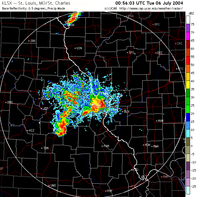 What a night - the west St. Louis County area had at least three severe storms move through the same general area. There were widespread wind damage and lots of hail reports from the first two storms. In the first one, Chesterfield had a 70 mph gust and nearby areas had hail to one inch (possibly from a trailing cell along the same line, just to the SW of the leading one). The second storm, which moved through between 9 and 10, produced 3/4 inch hail in Chesterfield and a 92 mph gust across the river at Scott AFB in Illinois. The third storm, moving into west St. Louis County around 11, produced 1.5 inch hail in Chesterfield, blew down large trees in Webster Groves, and resulted (combined with the earlier rain) in people being rescued from cars due to flooding near the Galleria in St. Louis County. Aside from the possible tornado just to the east, Edwardsville missed the worst of it, getting only scattered tree damage (mainly in and near the Willow Creek subdivision) in the first storm, pea-sized hail in the second storm, and nothing from the third one. If all that isn't enough, there were also two severe storms early the morning of July 5, too, and both of them hit parts of St. Charles Co. and west St. Louis Co. So for some parts of west St. Louis Co, that was 5 severe storms in one day!). A total of 155,000 customers lost power on the Missouri side of the St. Louis area, and thousands more in Illinois. Many still did not have power 24 hours later.