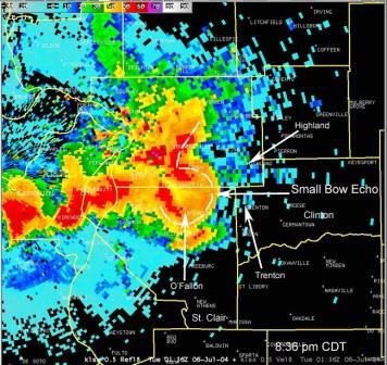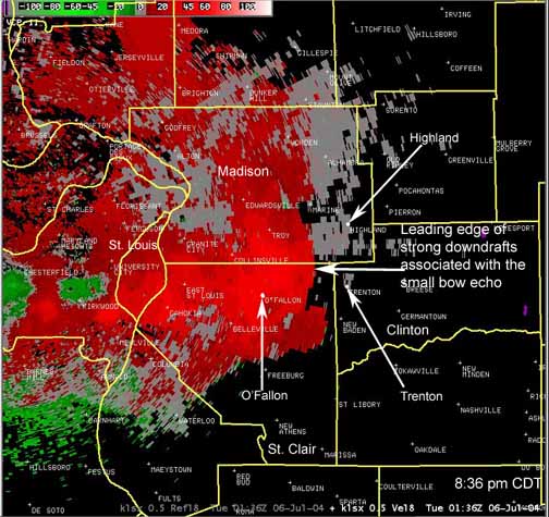 2. Reflectivity image centered on Madison and St. Clair Counties, 8:35 p.m., from NWS Damage Survey Web page. Note that the storm has now evolved into a small bow echo over southern Madison and northern St. Clair Counties, as noted on the image. The right angle in the dotted line drawn on the image highlights an inflow notch near the head of the bow echo, with a new area of heavy precipitation forming just northwest of the notch, just east or NE of Edardsville. The tornado occurred in the inflow notch, where this air flowing into the storm was moving in the opposite direction from the strong outflow to the south. This radar image is supportive of the conclusion that a tornado did indeed occur, since the radar shows a storm environment conducive to the formation of a tornado.