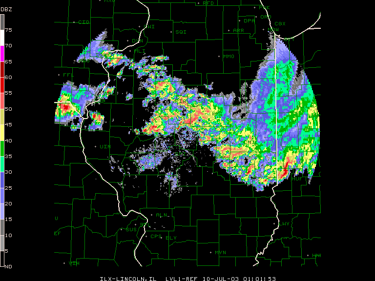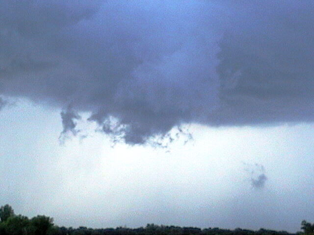 When I got back to route 97 I decided to call it a chase and headed back SE toward Springfield. I did notice a new, wide area of lowered base to my NE, and around 8:40 an SVS indicated rotation was occuring in far eastern Mason County. At the time I thought that the rotating wall cloud I was watching had occluded and a new one formed farther east. This may be true, but my later review of a radar loop showed two westward-moving outflow boundaries from the NW-SE alligned storms to the east. The rotating wall cloud and doppler-indicated rotation near Kilbourne occurred about when the first of these hit the updraft of the storm I was watching. Since the outflow boundary was moving west and the storm east, this may explain the brevity of the rotation. The outflow boundary, along with an inflow notch where the rotation was occurring, can be seen on this radar image from 8:00 p.m., just as the TOR warning was issued. The inverted white V just to the south of the storm over Mason County marks my location, on the county line of Cass and Menard Counties just south of the Sangamon River, which divides both of the latter counties from Mason County. The two outflow boundaries can be seen on this radar image, with the leading (westernmost) one just to right of and below the inverted V. The other one can be seen about one county to the east. The SVS that mentioned rotation farther east was issued around when the storm would have crossed the second outflow boundary, so I think these outflow boundaries may explain why the storm suddenly started to rotate but did not do so for long. Even so, this was a very enjoyable chase - the storms moved slowly and kept redeveloping in the same place, so they were very easy to chase - and very, very pretty to look at giving the good contrast and impressive structure.