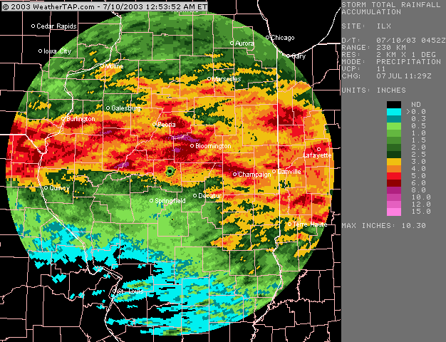 Interestingly, as shown in this LSR, these storms did not produce a lot of severe weather - one marginally severe hail report in Tazewell County being about it. However, they did produce considerable flash flooding, as seen in the LSR, and was warned for in this flash flood warning that was issued just before the tornado warning. This radar image showing cumulative precipitation tells a similar story, indicating 8 or more inches of rain in western Mason County, where the storms kept redeveloping in the same place.