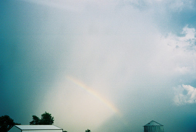 The upshot is that all I got today was a rainbow and some impressive cloud formations, and 300 miles of driving. Oh well, that's part of chasing. Even so, it's important to always remember that storms don't have to be severe to be photogenic. The rainbow, visible only in a sunlit precipitation shaft, made quite a nice picture. Also making a nice picture was this small cumulonimbus getting sheared apart by the strong upper winds. It looked like it wanted to be a LP supercell, but all it could do was get blown apart. This is the same cell that earlier produced the rainbow in the other picture.