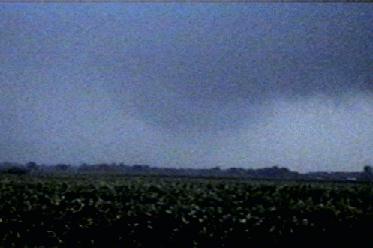 7:00 - We view what appears to be a rain-wrapped meso just east of Shipman, to our NW. Striations are evident above the scuddy updraft base. There is a very dark area under one part of it, but rain hides it so we can't see what it is. I realize we are going right into intense wrapping precipitation if we go any farther west and see a small parking lot near a utility property on the right of the road, slightly elevated. After blowing by, I turn around and return to it. Here I videotape the base and striations - again it has the look of a rain-wrapped meso but I can't see what is inside, in part because although the spot is high, trees are blocking the view in the direction of the center of the meso. Partly for this reason and partly because it is bearing down on us, I leave and move slightly east. After moving and getting clear of trees, we see large bulbous, partly rain-wrapped lowering. [ NOTE: Due to the poor contrast and wrapping rain, the contrast on this video capture has been enhanced. That is the only way in which it has been altered.] Although we had not heard the tornado report at the time, this - and the dark area we had seen minutes earlier - was almost certainly the remains of a tornado that was reported by police at 6:50 south of Medora, about 5 miles west of our location. The tornado touched down briefly in open country and dissipated, doing no damage. Again we were approached by intense precipitation wrapping around the south side of the meso - perhaps from a wet RFD, or from the next storm down the line, or a combination of the two. The whole thing was very HP-ish, with poor contrast and lots of wrapping rain. In order to avoid getting swamped by this oncoming precip, we moved back east to the intersection of 16 and 159. Somewhere en route I looked at my watch and saw that it was 7:05.
