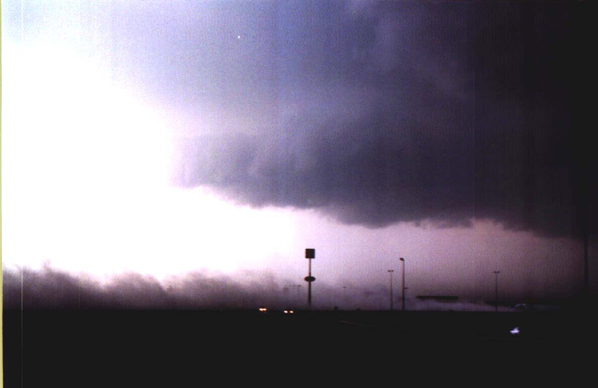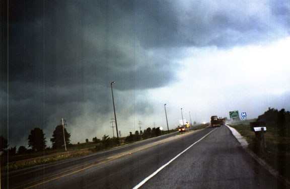 Around 7:15 - I stop for 10 minutes or so at the Carlinville exit to photograph and videotape the approaching gust front. As it nears, a precip core intensifies rapidly just to my west, and I decide to drop south to avoid it. Shortly after 7:30, though I cannot avoid the next one as it crosses I-55 just south of Litchfield, and I am in blinding horizontal rain for about 5-10 miles - near zero vis at times.