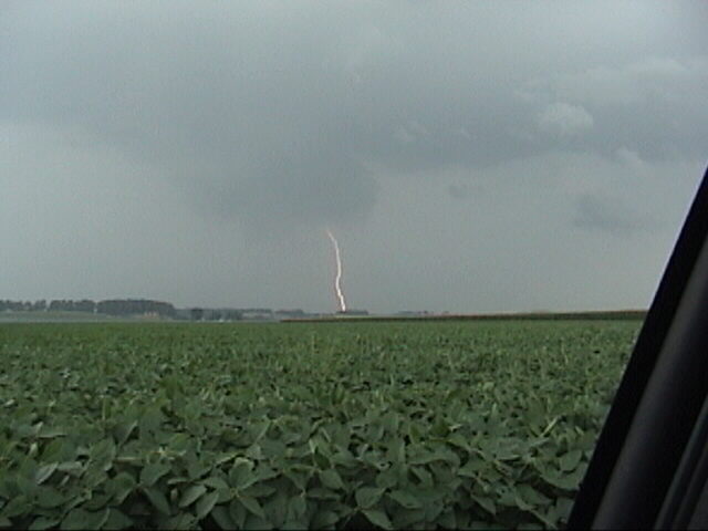 I managed to get on two severe storms, the first one being the storm that prompted the SVR warning for St. Clair Co. It had a large but non-rotating wall cloud which was located just east or southeast of Lebanon, IL. This lowering was directly under the main updraft of this storm. I watched this storm for about 15 minutes, until gradually the wall cloud became detached from the base of the parent storm cloud as the storm began to be seeded by another storm to its west over Belleville. So I broke off and cut south to get ahead of this storm, which also went SVR-warned at 6:45 p.m. I got in good view of this storm south and southwest of Mascoutah, IL, as it produced a roll cloud and later a lowering of some kind under the gust front southwest of Mascoutah. Both storms produced lots of CG, with the first one dropping nickle-sized hail and producing a 60 mph gust in Germantown and the second producing dime to half-dollar hail in much of the Belleville area into Fairview Heights. Got some decent structure pics and a couple nice vid caps of CG lightning, including this one of a CG bolt under the lowering on the front of the storm. Not a bad chase for not leaving until 6 and home by a few minutes after 8!