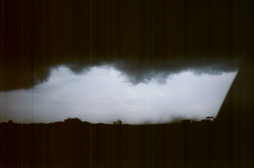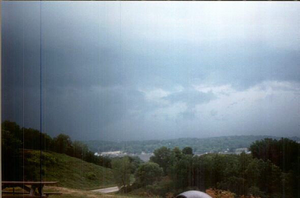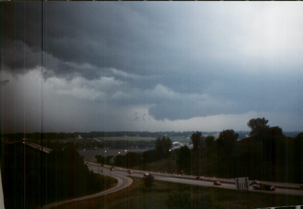 We decided to cross the river and park at the Illinois welcome center, which is on a high overlook facing west at the top of the bluffs. One storm passed north of us, displaying a wall cloud at times but no funnels or rotation that we could see. Two more came behind it, one to the northwest with what first looked like a large wall cloud but may have been scud as it became totally detached from the parent cloud. To the southwest was an intensifying precipitation core with lots of outflow clouds, which spread over us with strong outflow gusts.