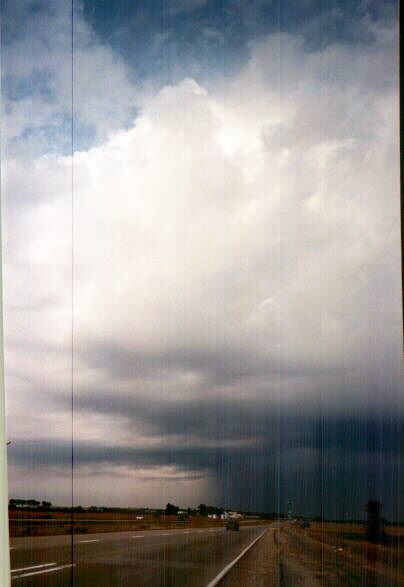 Around 5:00 - I was now getting close to the storm again, and saw that it was backbuilding rapidly westward. It looked like a solid line to my N, but I saw breaks in the precip under updrafts of cells in the line. One to north formed slight lowerings under an updraft, with heavy precip to its east. Lightning was now increasing rapidly. I passed two more spotters or chasers watching the storm, and stopped about 5 mi west of 51 on 1400 N (I think). I stopped to tape and photograph the storm; this cell moved to my east with another to its west. I followed the eastern cell back east to U.S. 51 where it almost overtook me as it moved SE - it was just north of the E-W road I was on. Scud caught in outflow was now moving SW under the cloud base which was moving to the SE. Strong inflow structure was evident just to my NE, with lots of CG. Then I noticed that the cloud base almost overhead was yellow-green - possibly from light being refracted through hail. But now, I was in outflow from N/NE and the storm was about to overtake me. I headed south on U.S. 51 to El Paso to get ahead of storm.
