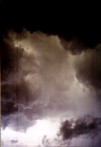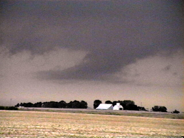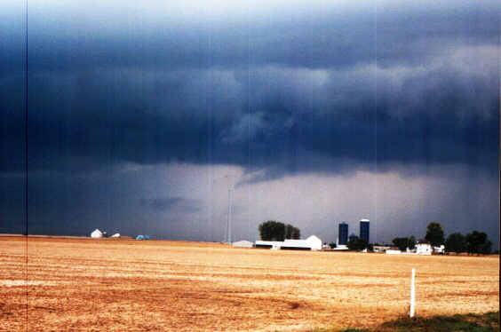 Around 4:00 - 4:30 - I exited I-55 at Chenoa, headed a little north on old Route 66, and parked and set up tripod on the closed side of old Route 66 just north of Chenoa as the tail-end storm approached. To the N and NE was a Shelf cloud, some lightning, and heavy rain. To the W and NW was a ragged updraft base with brief lowerings. This apparent inflow structure was one of the more interesting. After 20-30 minutes this part of the line went outflow-dominant, as new storms were forming farther west. I left, passed by a spotter/chaser just S. of where I had been, and worked my way west on U.S. 24 to U.S. 51, then worked my way northwest of El Paso on back roads.