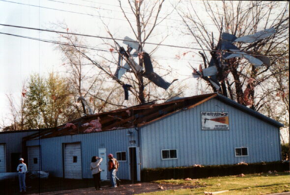 Just to the east, the west half of the roof of an auto body shop was lifted off and much of it ended up in trees east of the building. Here is a photo of the damage to both of these buildings.