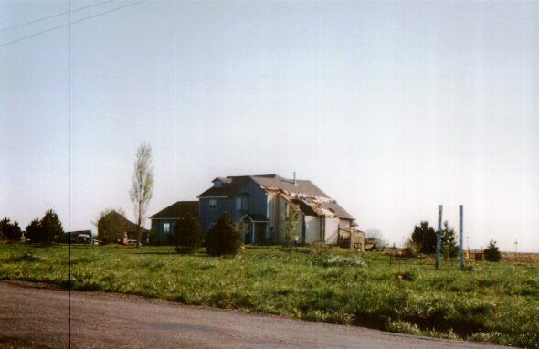 I also took some pictures 1.5 to 2 miles further east along the damage path of the tornado, which was rated F1 based on a National Weather Service damage survey. This farm, located about 1.5 miles east of 159 on Goshen Rd., lost the roof of an outbuilding. Part of it landed in trees NE and N. of the building; one piece was carried a quarter mile to the NE. Half a mile further east, this house lost part of its roof. This house is over 2.5 miles east of the rist damage I saw, and only about 1/2 mile west of I-55.