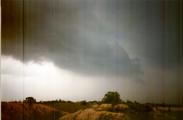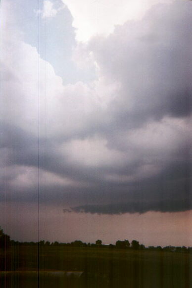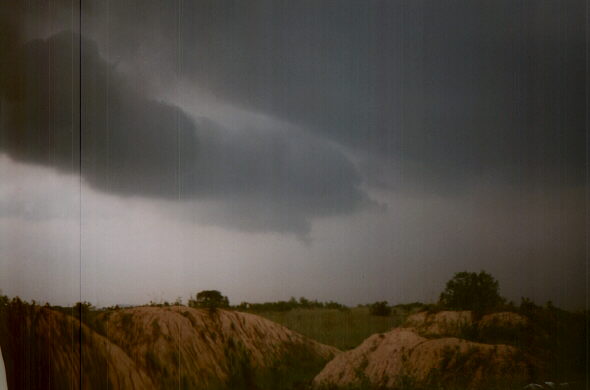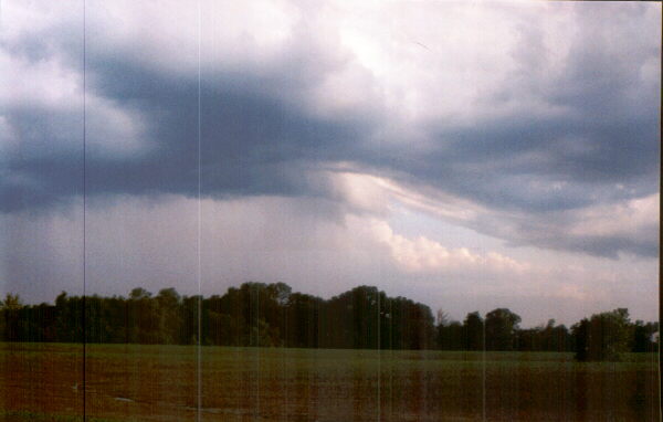 Check out this awesome lowering that Alice and I saw southeast of Terre Haute, IN on June 21, 1997. This feature, similar to the one in the section above this one (but this one was front-lit), formed on the southern edge of a wall cloud at the tail end of a squall line. A severe thunderstorm warning was in effect when I took this picture for Clay County, where the precipitation behind the lowering was falling.