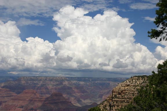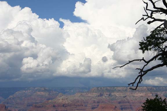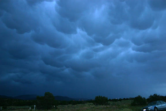 ADDED SEPTEMBER 7, 2005! On August 9, 2005, Alice and I visited the Grand Canyon and were treated to this spectacular view of a storm across the canyon. Here is the same storm 15 or 20 minutes later, after it has dramatically intensified, forming a pronounced lowering. Not sure exactly what this was, since the storm was at least 30 miles away, but there were no reports of severe wx with this storm. Earlier in the same trip, I got this picture of mammatus clouds near Santa Fe, NM, and on the way home on August 17, I caught this shot of a line of thunderstorms with an updraft illuminated by the setting sun east of Amarillo, TX. Here is the sunlit anvil of the same cluster of storms.