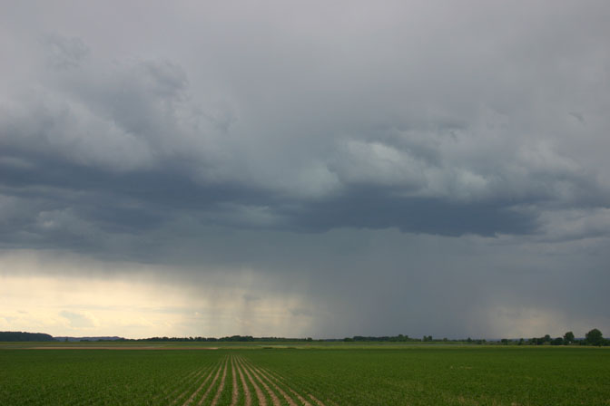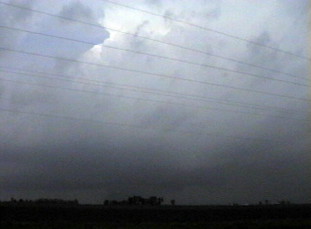 Here is a Snappy video capture of the lowering produced by the first storm, taken from a couple miles southeast of New Douglas. In this second video grab, the lowering appears to take the shape of a funnel cloud, although neither our visual observation nor the video could confirm that rotation was occuring.