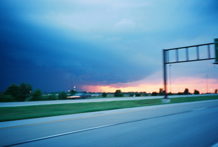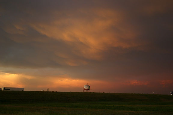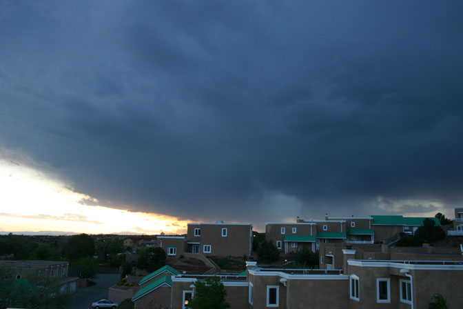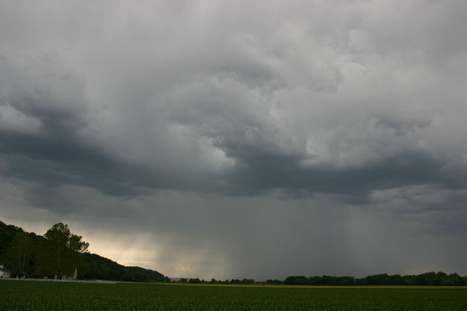 On May 15, 2005, I photographed a high-based thunderstorm approaching Santa Fe, NM near sunset. These types of storms are common in the low-humidity environment of New Mexico. Like many of these storms, this one produced only light precipitation, but the storm was very pretty as it interacted with the sunset. Such high-based storms are much less common in Illinois, but some did form on May 27, 2005 as strong upper winds and a boundary forced what little moisture was available into high-based thunderstorms like this one near Valmeier, IL. After a while other storms developed to the north, producing more truly elevated convection over the cooler air near the surface north of the boundary and from the outflow of the earlier storms.