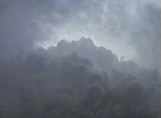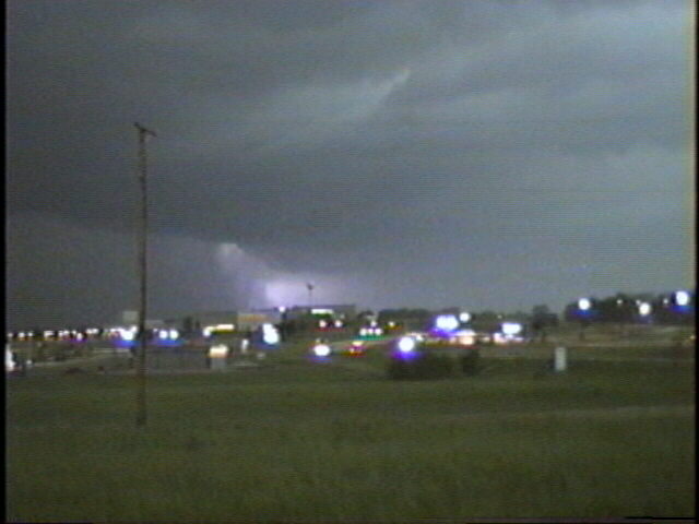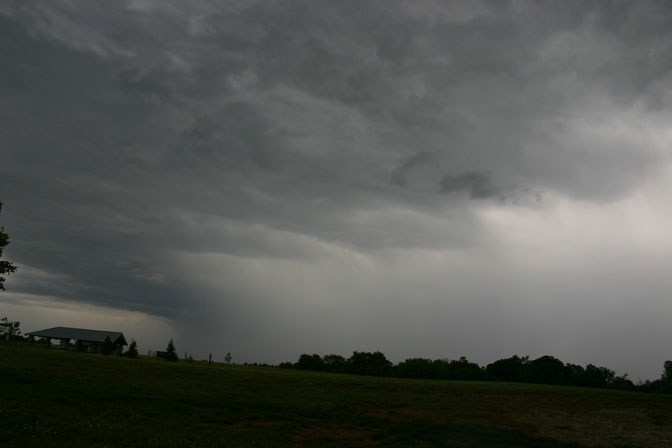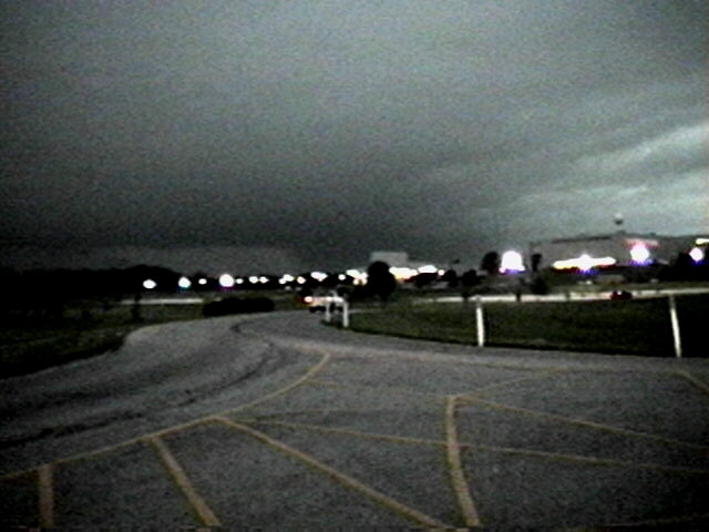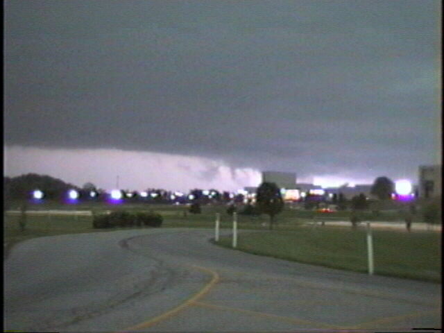 On May 6. 2003, I observed and videotaped a monstrous HP supercell near Union, MO. While viewing the storm I encountered inflow winds around 50 mph as an inflow band raced westward over my head into the storm. Lighting revealed scud as well as some suspicious lowerings under the area where the inflow band was racing into the storm. Both scud and a possible funnel can be seen in this video capture (at a point of maximum lightning illumination), as well as a lowering of an undetermined nature behind the building in the right center of the picture. In this picture, a larger rain-wrapped lowering is visible, again illuminated by lightning - but it is not possible to tell if it is a funnel, wall cloud, or something else. This storm did produce an unconfirmed tornado about 15 miles west of the location where I got this video, and a confirmed tornado as well as severe straight-line wind damage about 20 miles southeast. The storm stalled in its eastward motion around the time these pictures were taken, then turned sharply to the southeast as it interacted with a developing line of storms to its south. (On the first video capture, contrast is enhanced to make the cloud structure easier to see.)