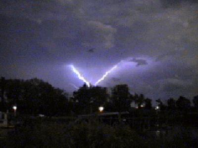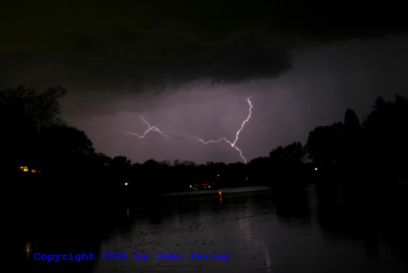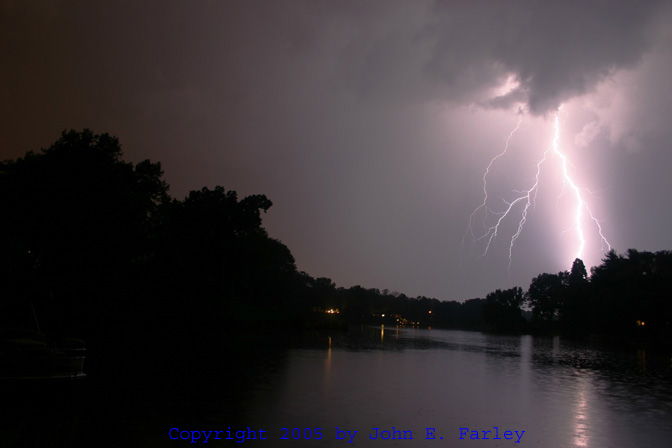 ADDED SEPTEMBER 20, 2005! A couple weeks after I got the pictures linked in the next item, I was able to get a nice shot of a bolt of cloud-to-ground (CG) lightning across Dunlap Lake in Edwardsville on September 18, and of cloud-to-cloud lightning on the back side of a line of severe thunderstorms on September 19.